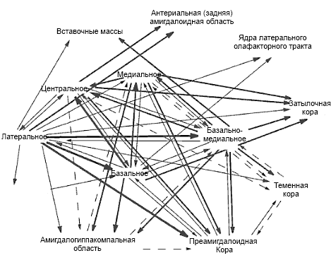 Общую схему внутренних связей амигдалярного комплекса приматов мы представим согласно работе[8]. Как уже отмечалось латеральное ядро (дорсальная его часть) получает множество связей от сенсорной коры и посылает свои связи практически во все остальные ядра амигдалы, хотя последние и различаются по своей мощности. Наиболее сильные проекции латерального ядра уходят во все отделения базальных ядер и преамигдалоидной коры. Важно отметить, что его проекции в центральное ядро амигдалы сравнительно слабы относительно, например, связей с базальными ядрами.