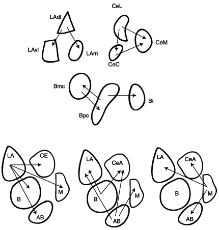 Приведем для примера схему [7] основных внутренних и межядерных связей для амигдалы крыс (см. рис., обозначения как и ранее) полученных анатомическими ислледованиями. Большинство из этих связей являются глютаматоэргическими. В работе [7] подробно обсуждаются внутриядерные связи на примере латерального, базального и центрального ядра амигдалы. Однако, там отмечается что нейроны базального и латерального ядра имеют обширные дендритные деревья расположенные и в соседних отделах этих же ядер. Психофизиологическое значение подобных связей сейчас остается не ясным.