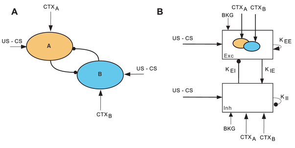 В работе [12] представлена простая нейросетевая модель базального ядра амигдалы поддерживающая электрошоковые (US) условные стимулы (CS) и множественные контекстуальные входы (CTX), например, из гиппокампа или медиальной префронтальной коры. На приведенной схеме показаны две популяции нейронов А и В базального ядра, которые получают разные внешние контекстуальные стимулы, но общие условные стимулы (US-CS). Эти две популяции соединены между собой отрицательными связями.