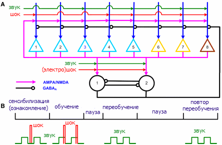 В работе [11] представлена простая нейросетевая модель латерального ядра амигдалы поддерживающая обучение шоковому условному рефлексу и его забывание (переобучение) без отрицательного подкрепления. (Подробнее см. в указанной открытой статье по ссылке.)